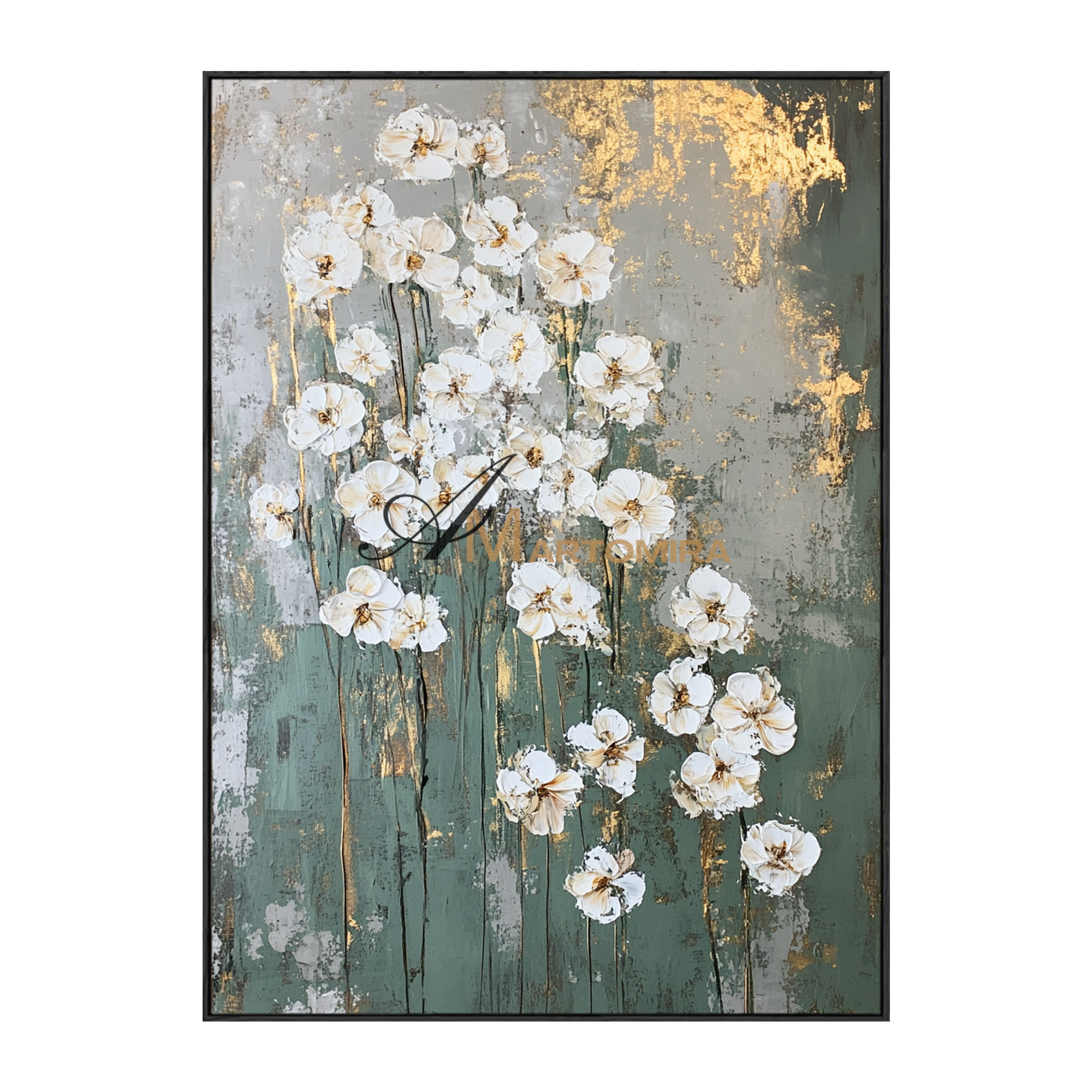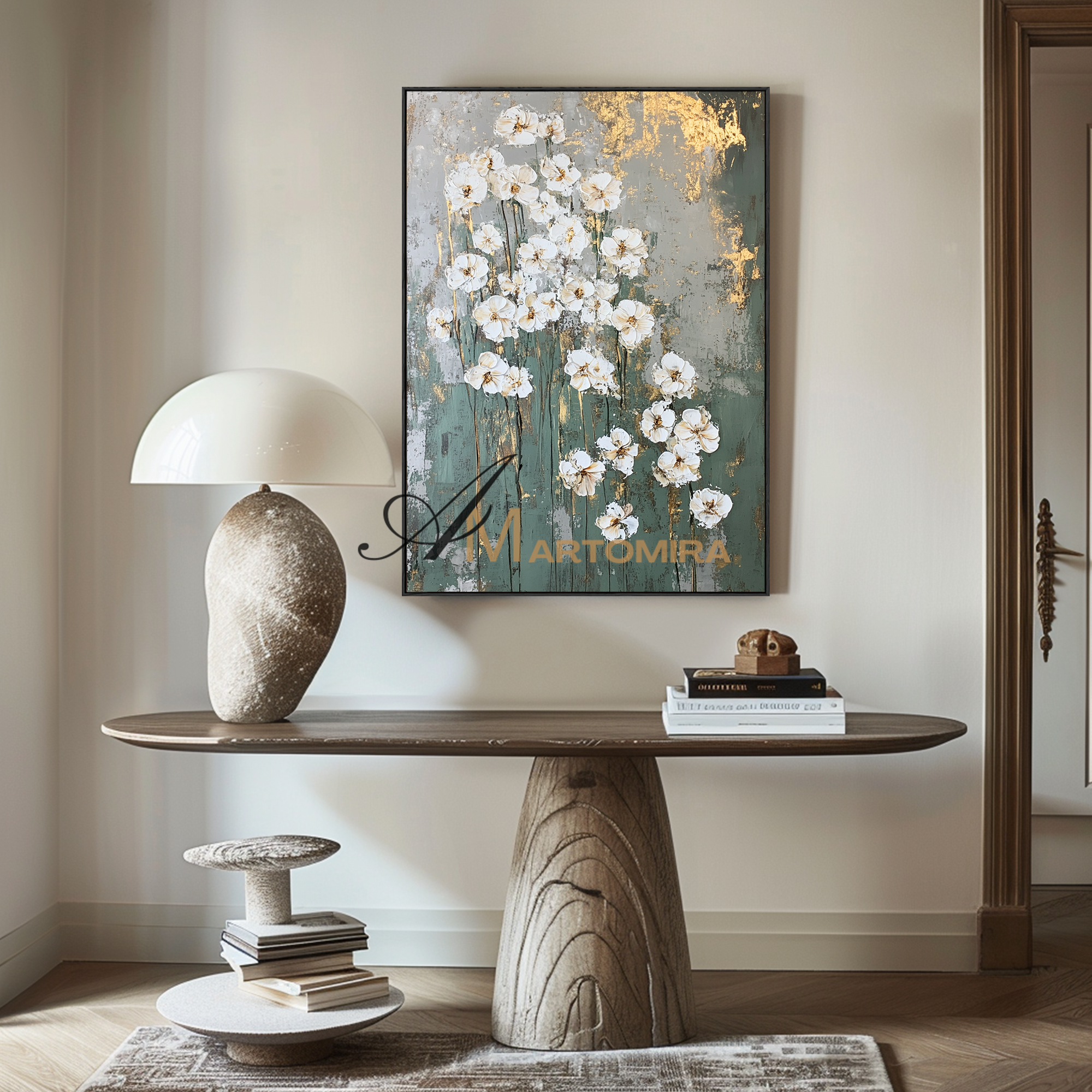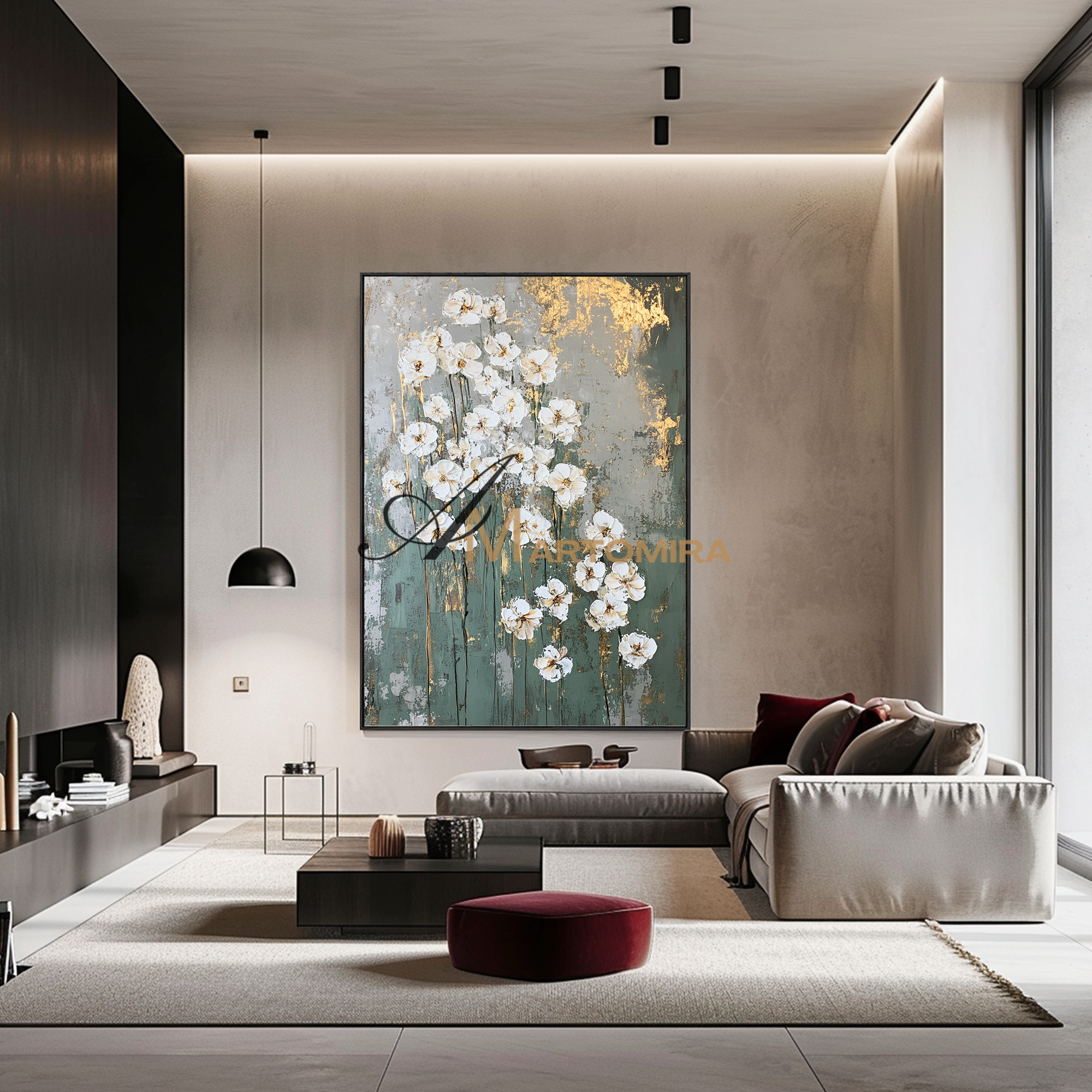 Acrylmalerei mit Blumenmotiven | Abstrakte Blumen-Wandkunst | Abstraktes Gemälde in Grün und Gold #CF105