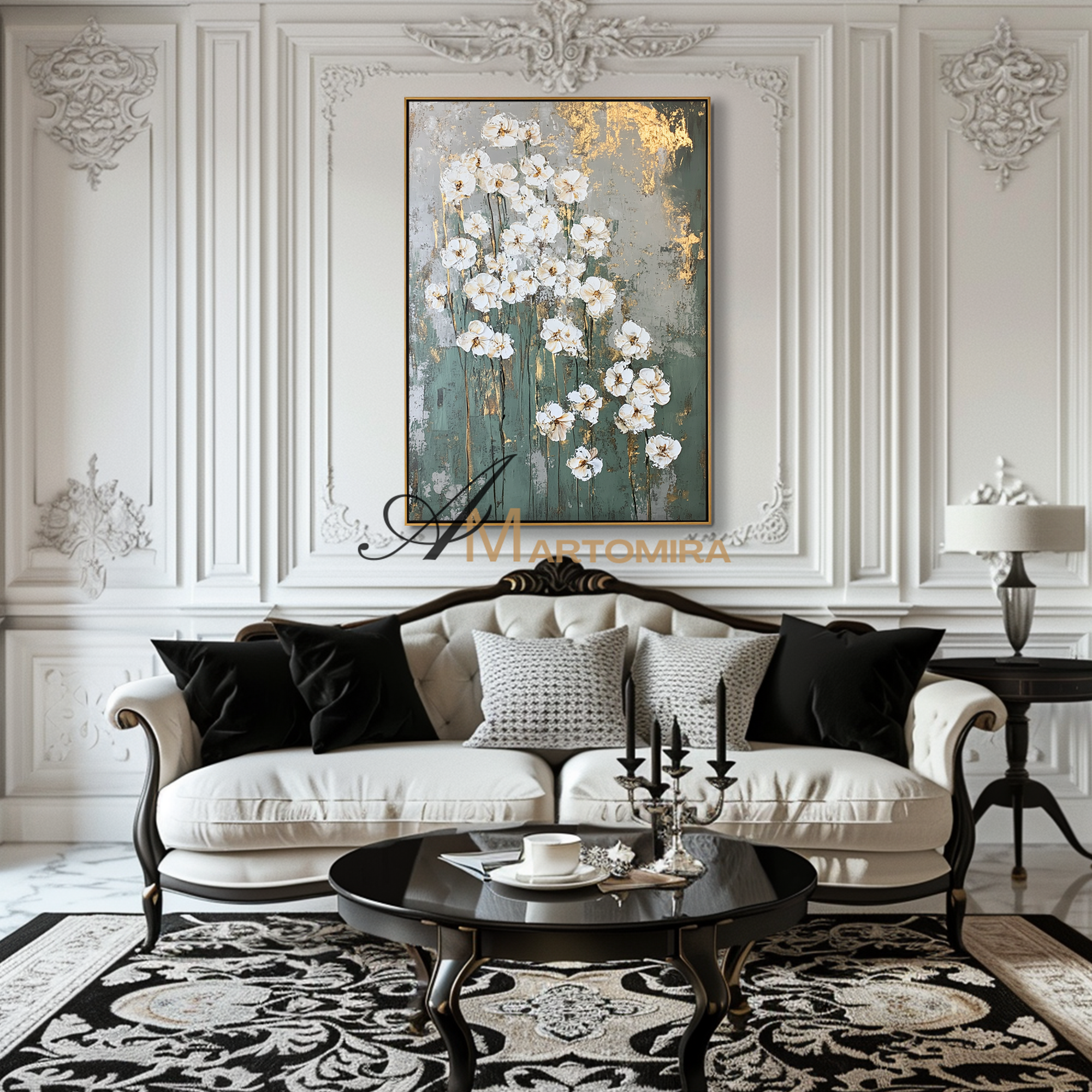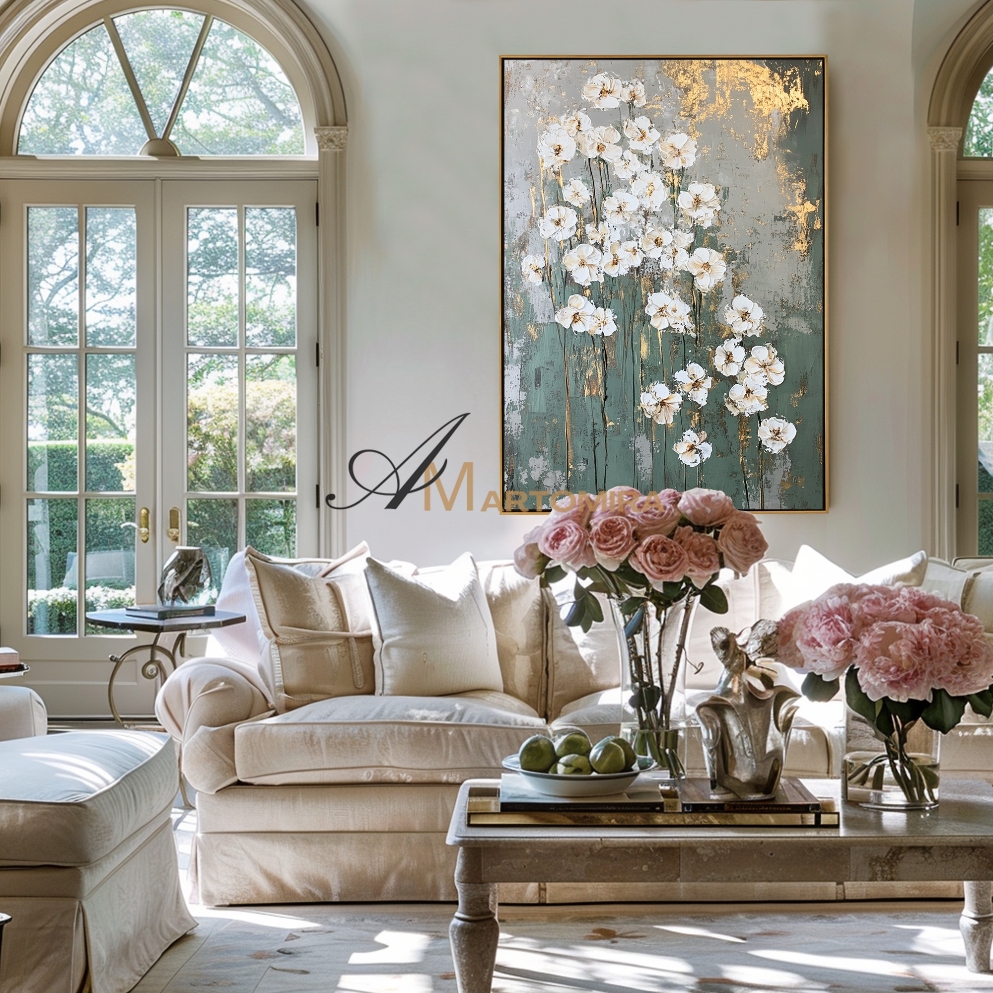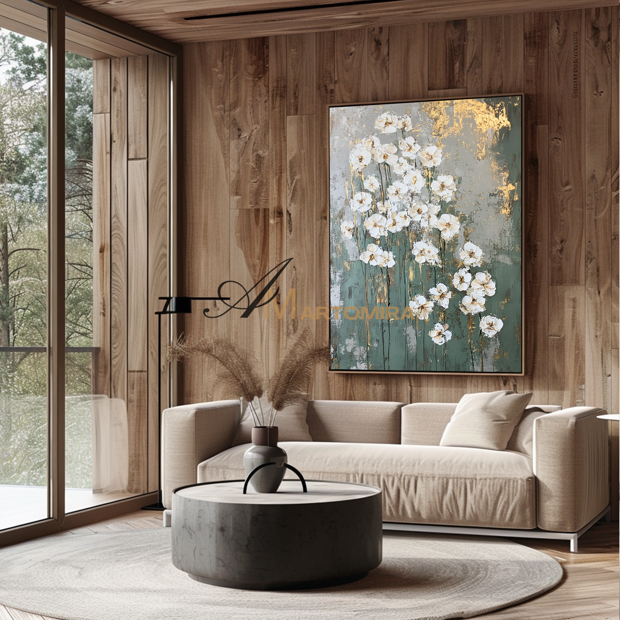 Acrylmalerei mit Blumenmotiven | Abstrakte Blumen-Wandkunst | Abstraktes Gemälde in Grün und Gold #CF105