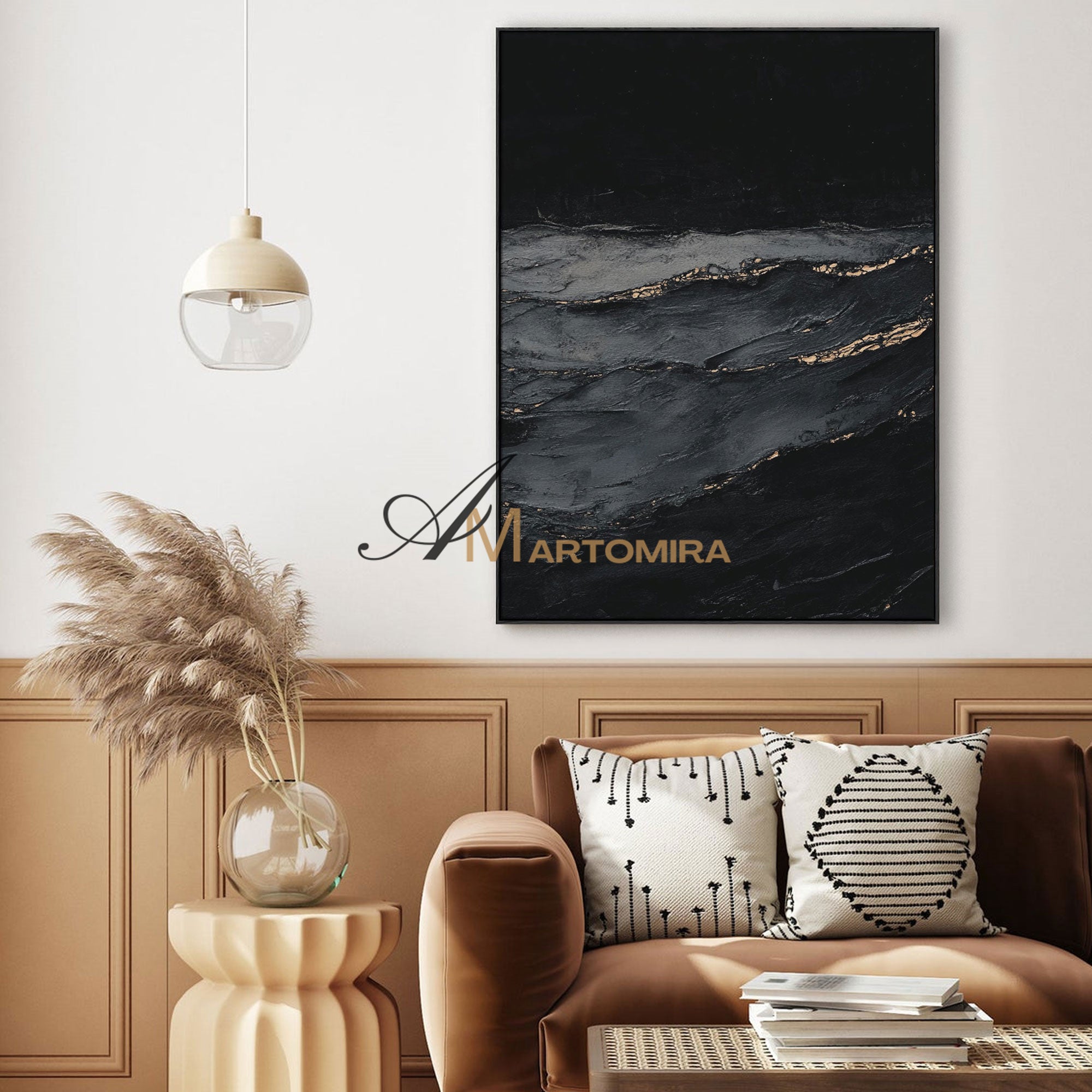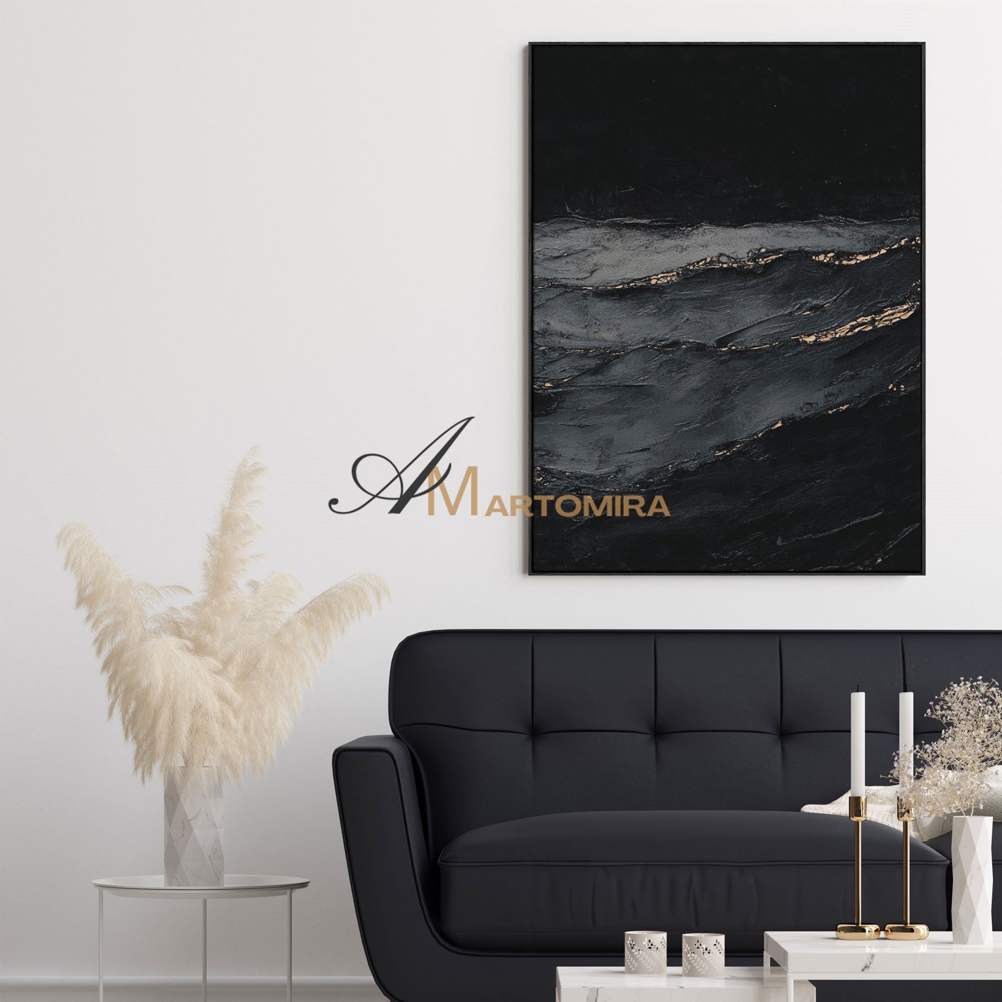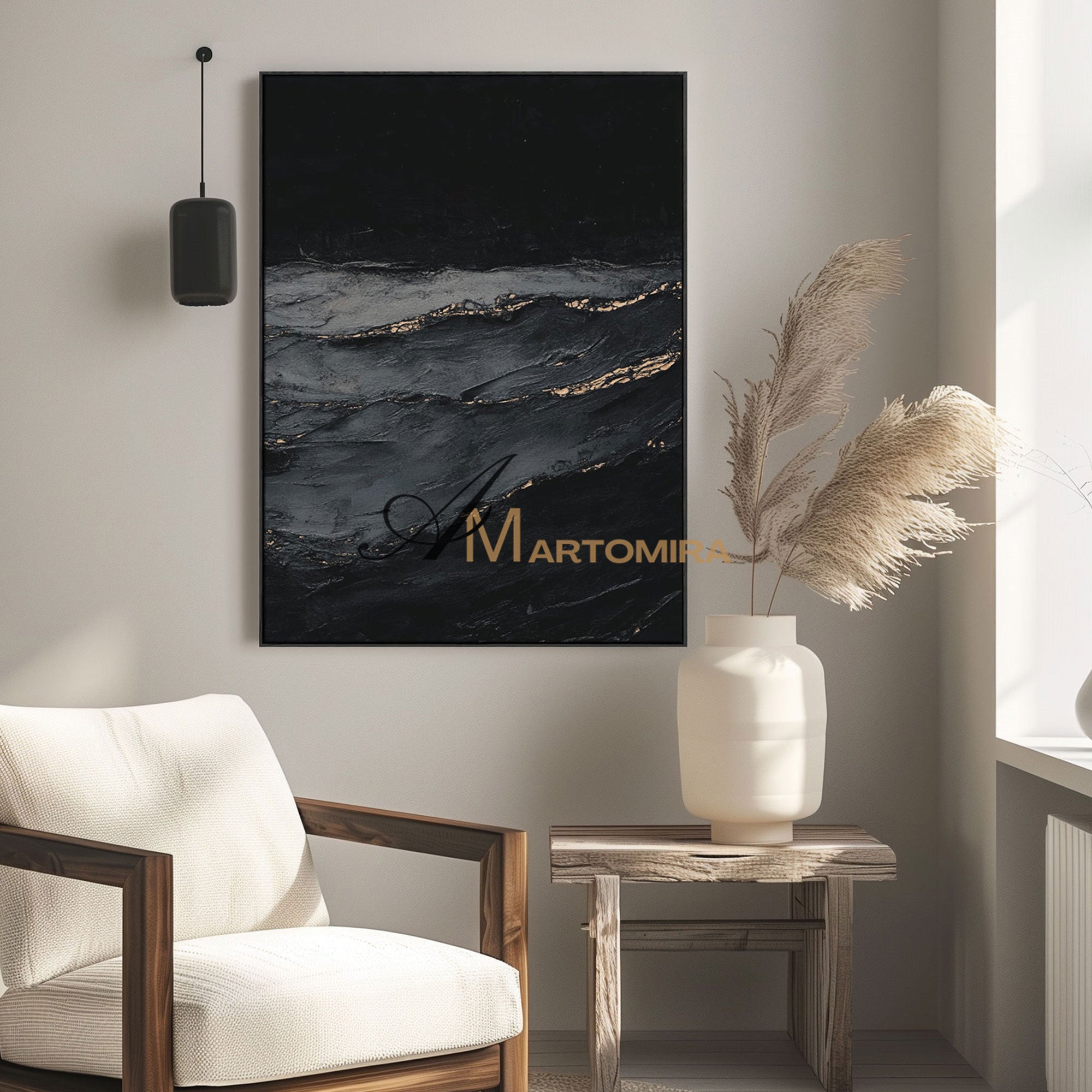 Schwarze Strukturkunst | Ozean-Wandbild | Abstraktes Wellenbild | Großes abstraktes Landschafts-Wandbild #POS060