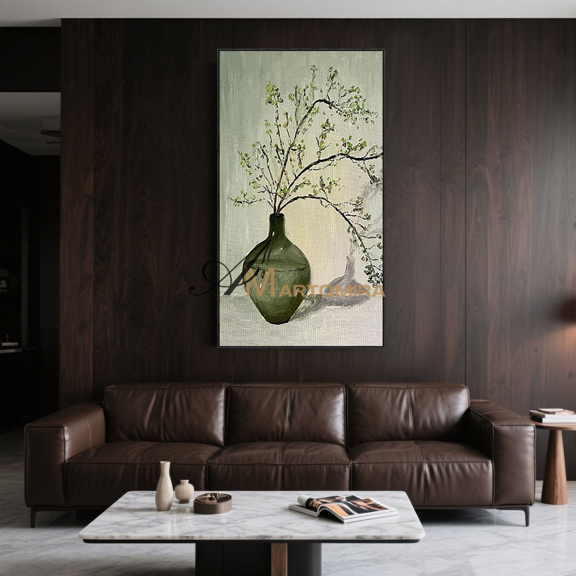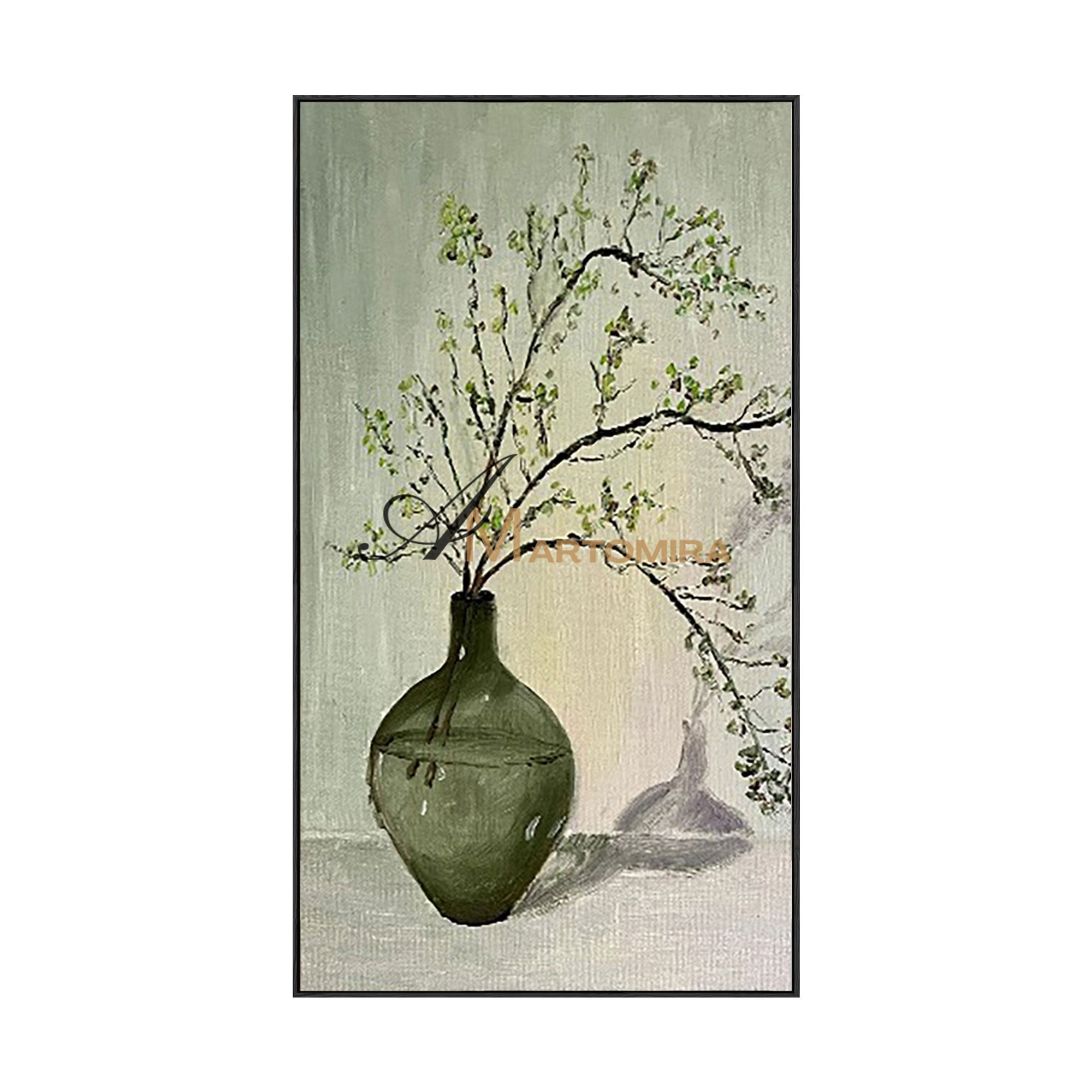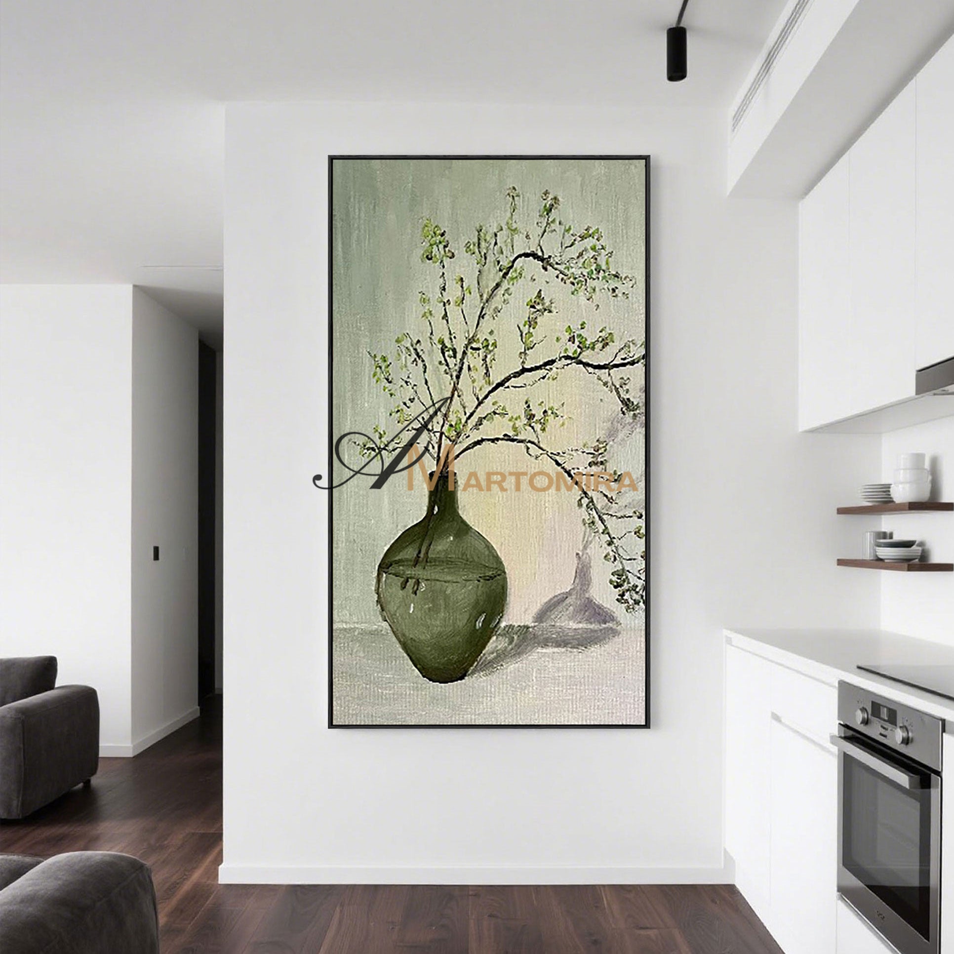 Großformatiges Wandbild | Grünes abstraktes Gemälde | Gemälde mit Vase und Blumen | Wanddekoration #MF012