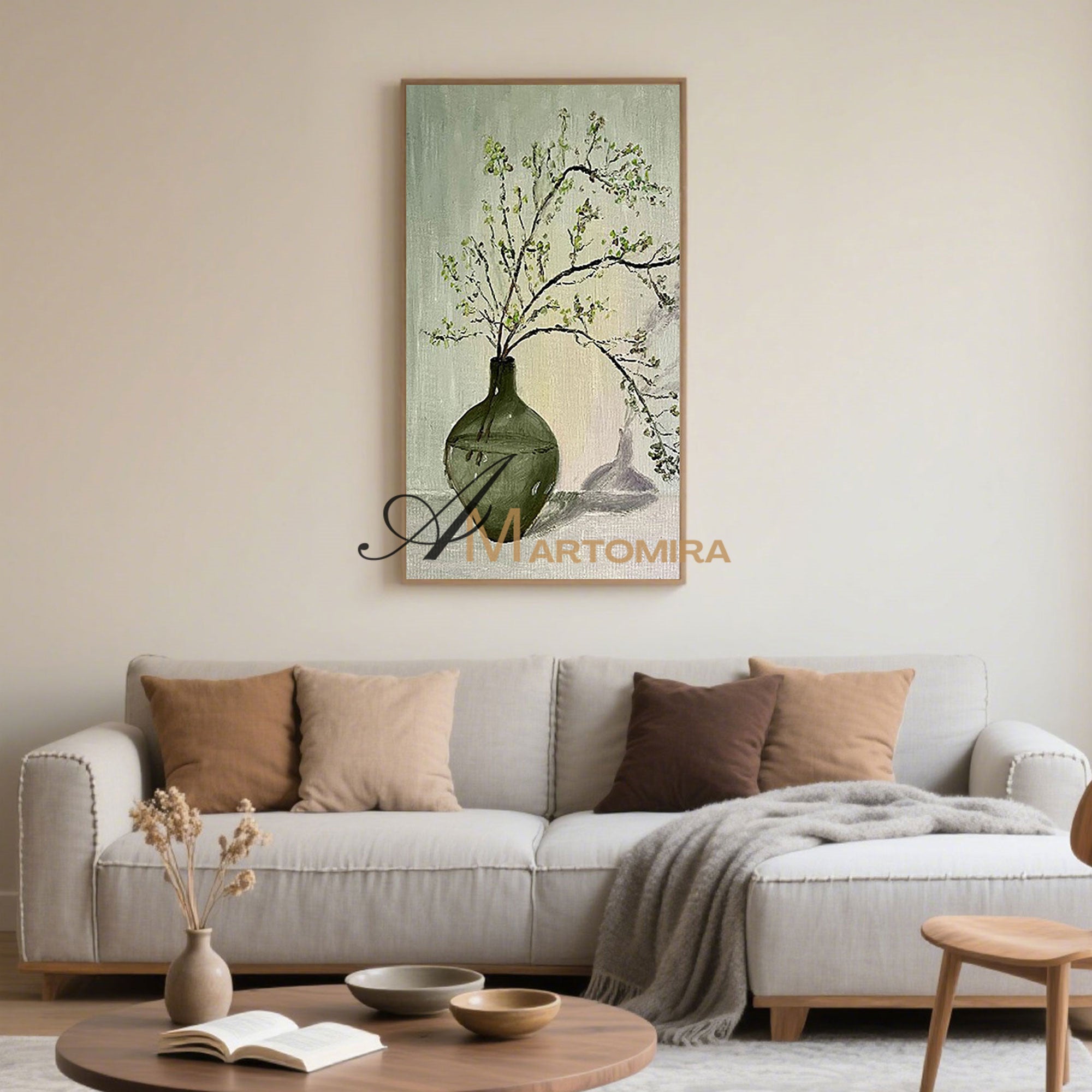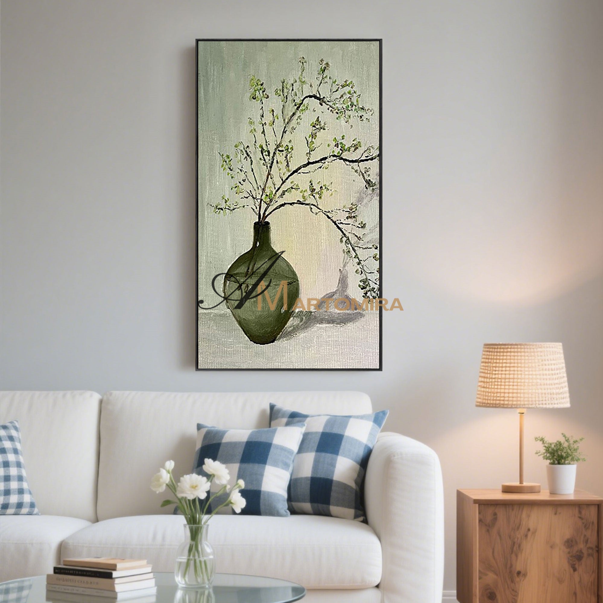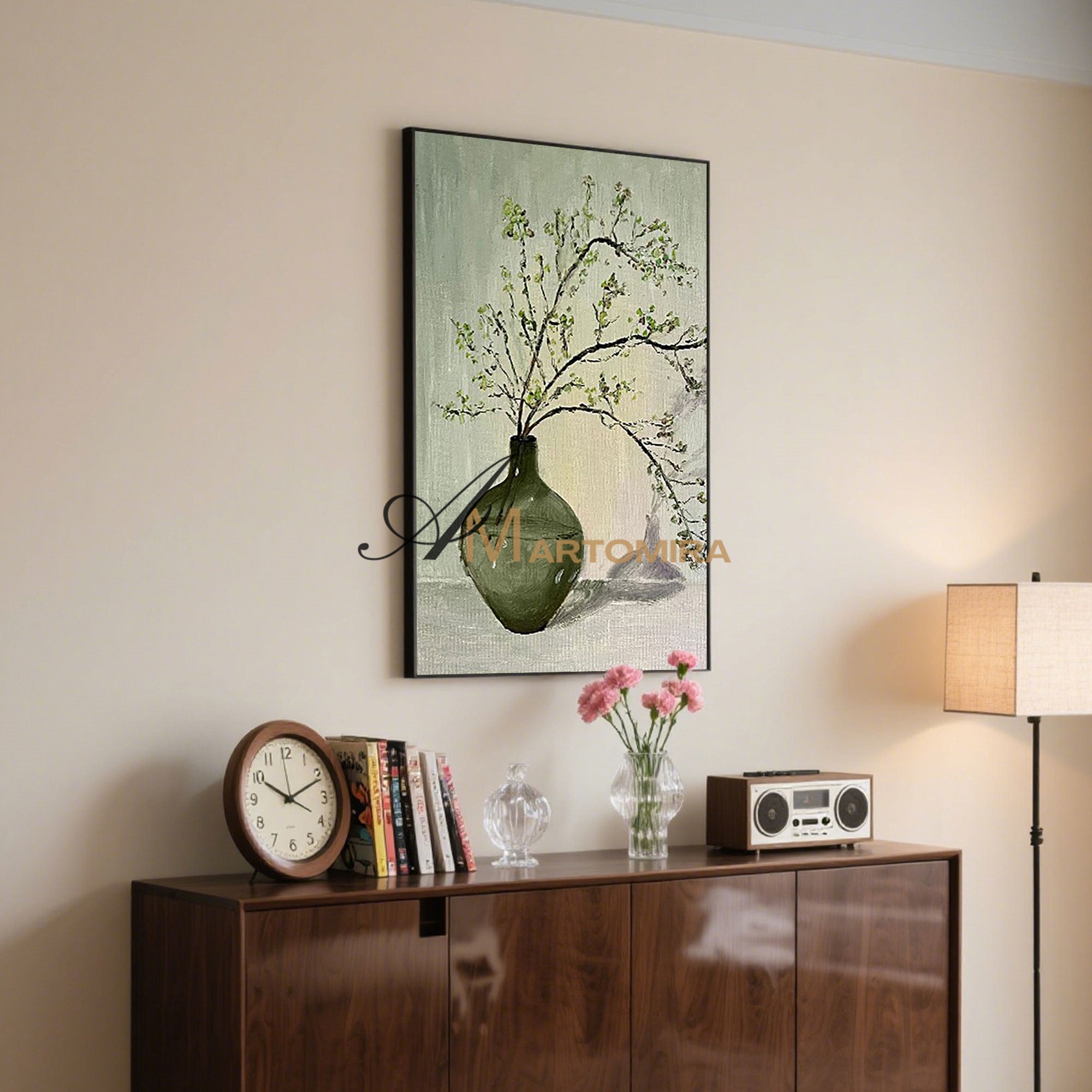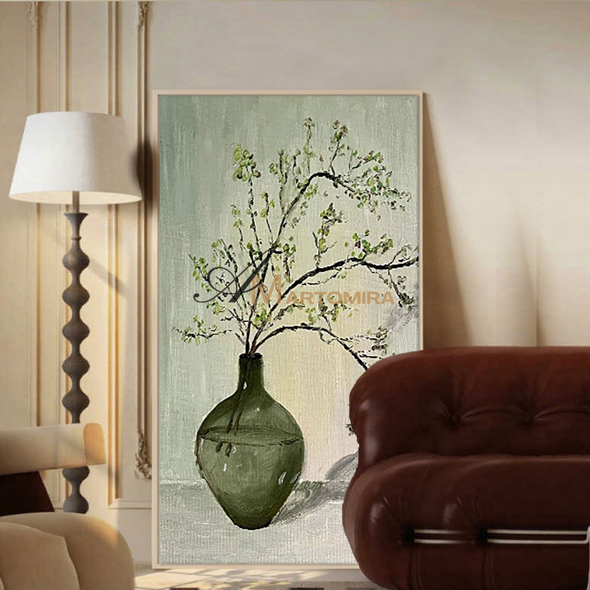 Großformatiges Wandbild | Grünes abstraktes Gemälde | Gemälde mit Vase und Blumen | Wanddekoration #MF012