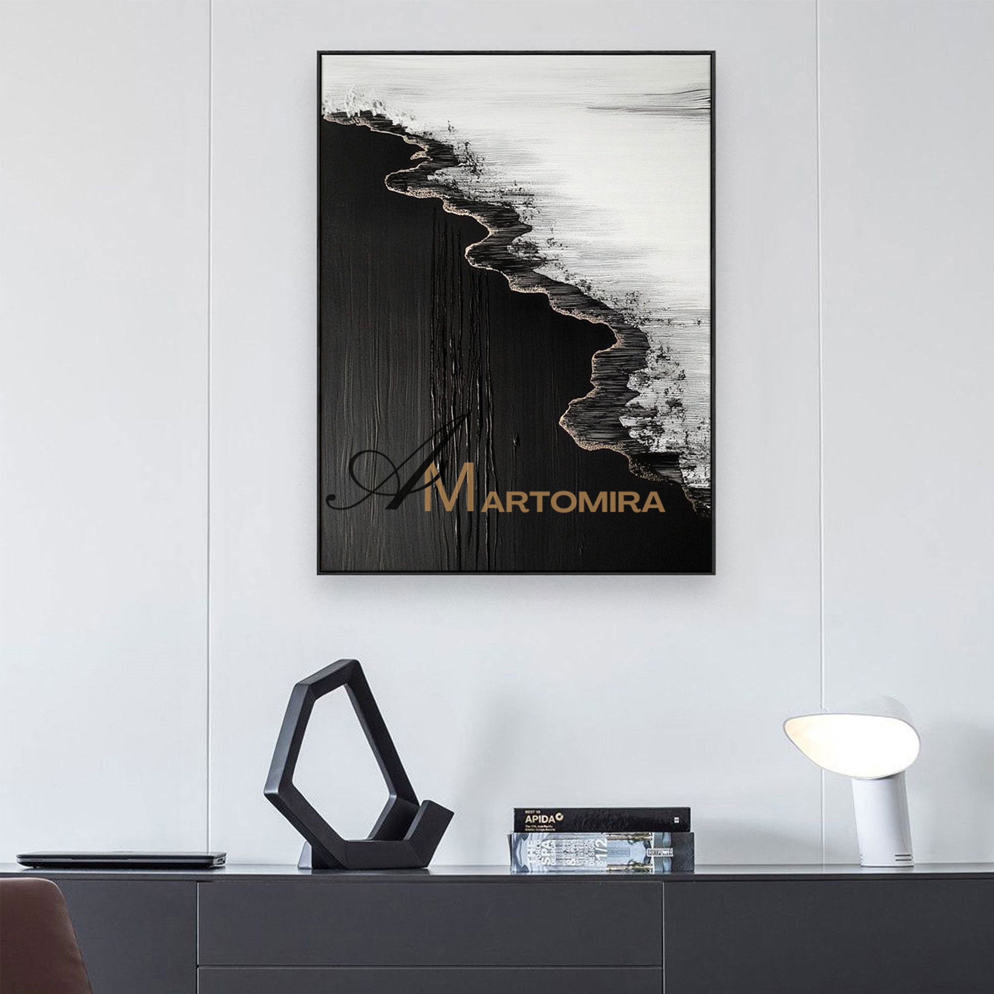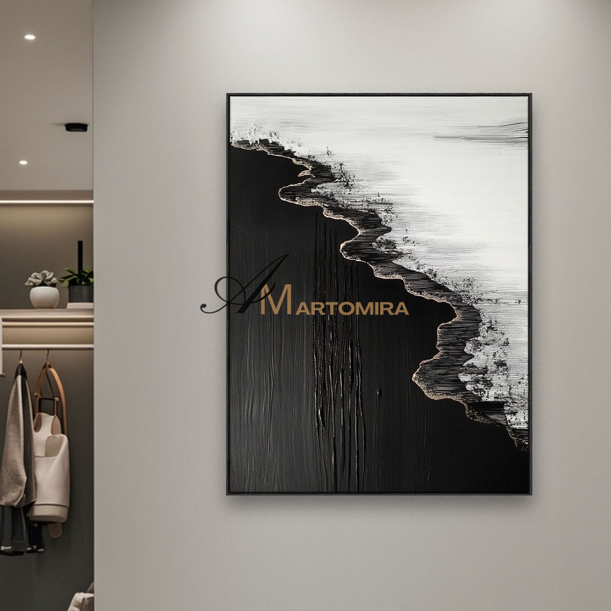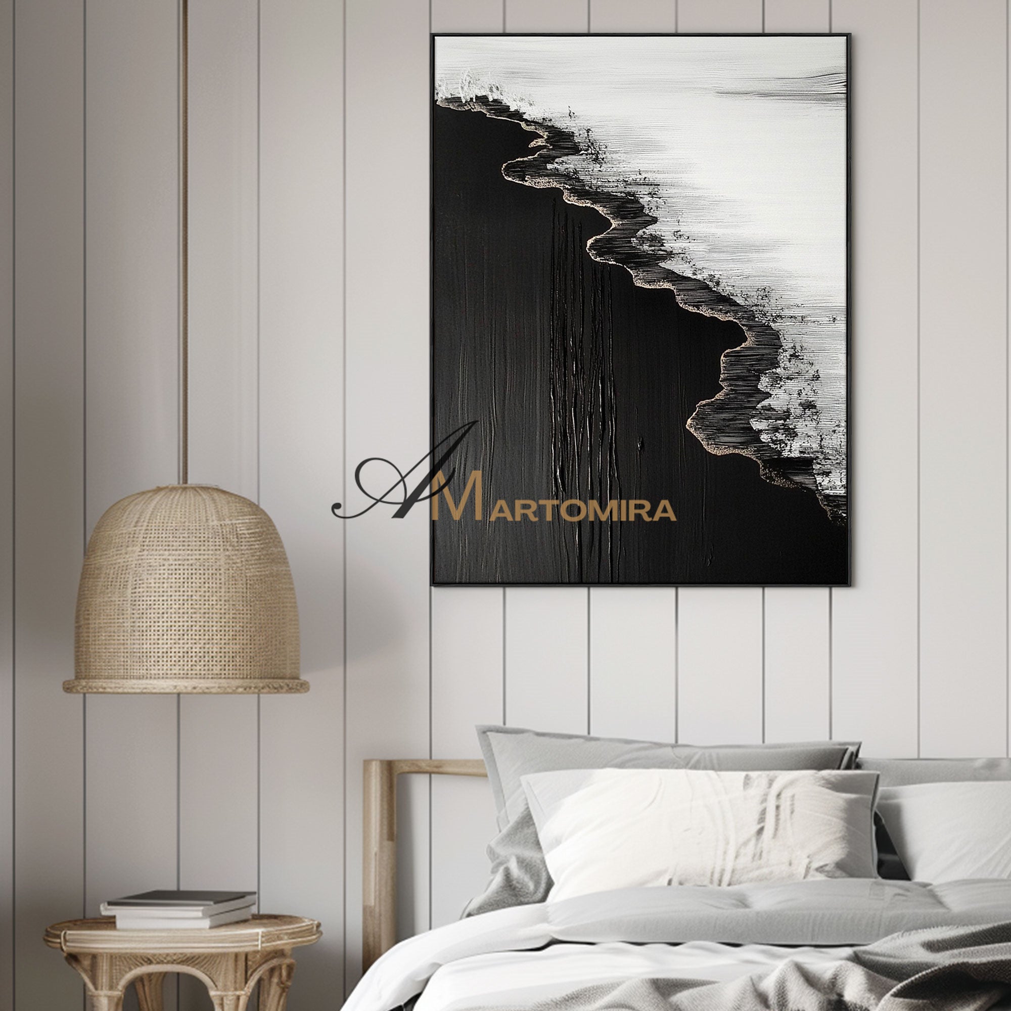 Strandkunst-Gemälde | Schwarz-Weiß-Wandkunst | Abstraktes Meeresbild | Wandbild fürs Wohnzimmer #POS052